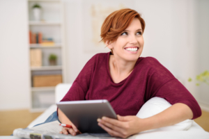 lachende junge frau sitzt auf dem sofa und hält tablet in der hand